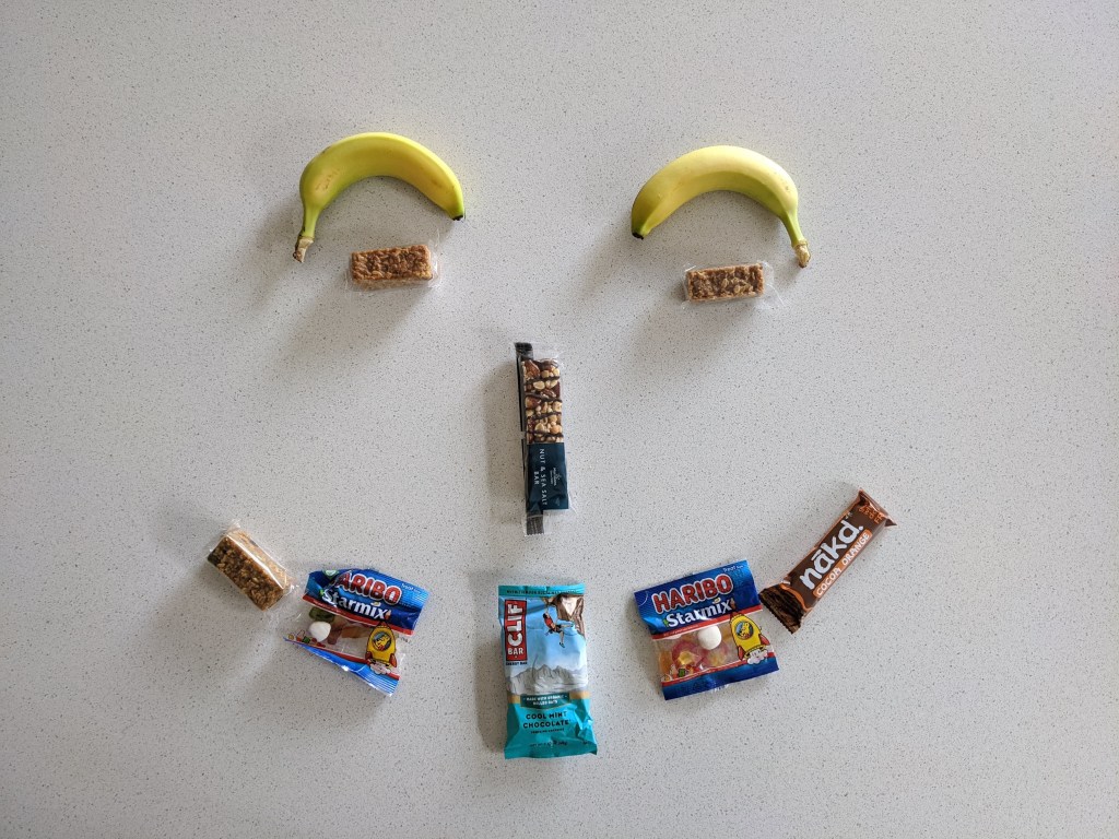 Based on the learnings from the first half I filled up the running pack with food and a portable battery for my phone. A random mixture as you see but covers my main areas of ‘on-the-go’ nutrition excluding water, of course.