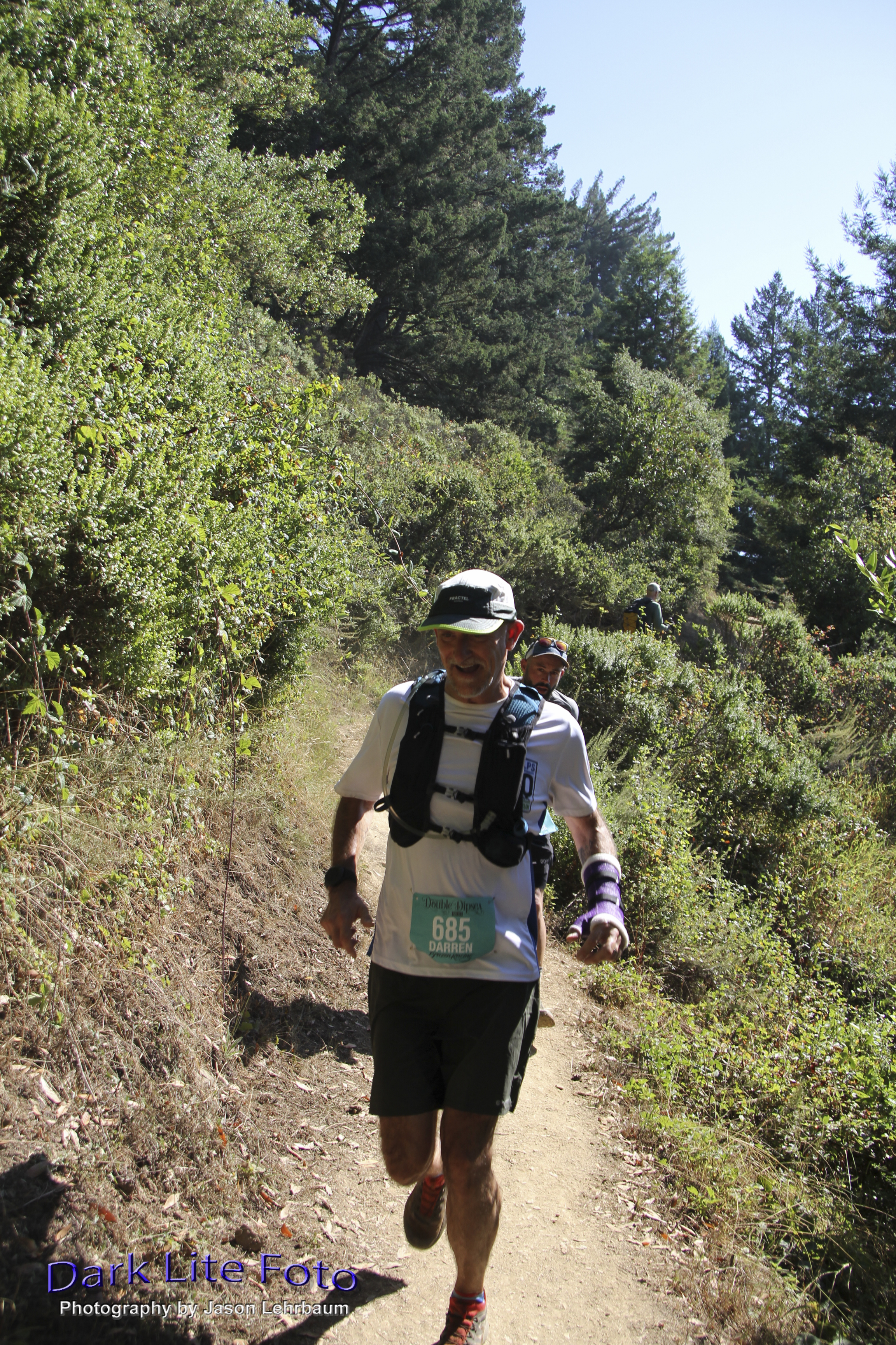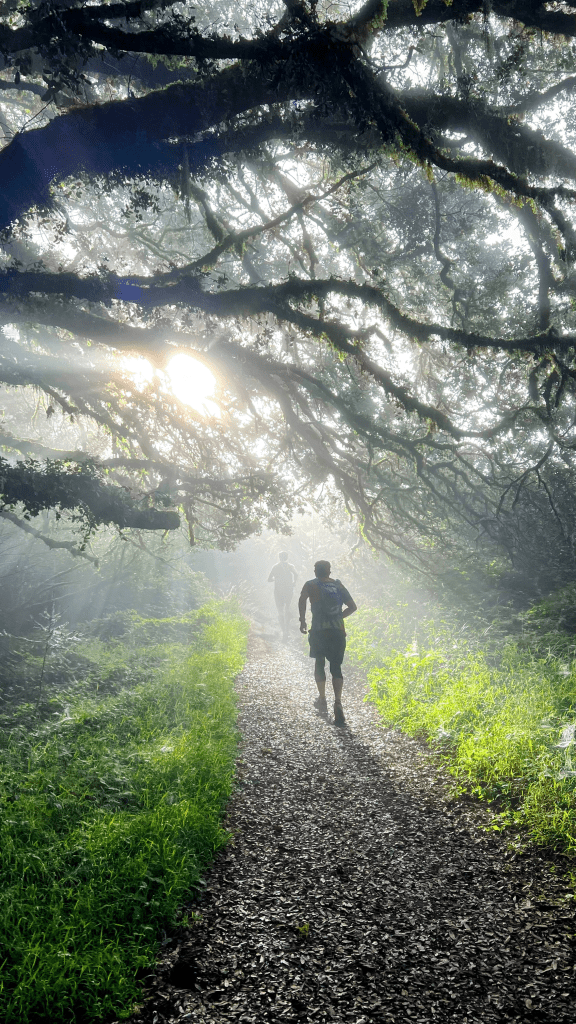The vista didn’t last long and soon we entered another forested area. The height gain continued and we were beginning to push through the fog, the sun’s rays streaming in silhouetting the runners ahead of me.