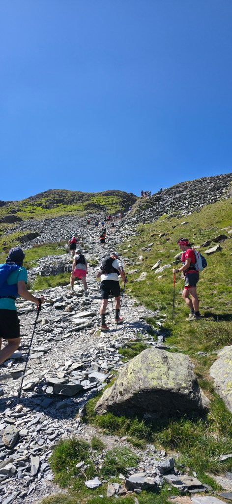 This section is formed of large rocks strategically placed between areas of natural formation however, there’s nothing consistent in the spacing, height and width. Some runners have no fear and oodles of confidence to rush down skipping effortlessly past me at times. While I try my best to follow I spend a lot of time picking my way down. After negotiating the top half of the trail the gradient begins to ease and paths begin to return in between occasional sections of natural rock formation that not even the most experienced runners can skip across. Basically, it’s time to use your hands and scrambling your way around. Now, while the rocks and finding a route down aren’t challenging enough there’s also the groups of walkers on their way up to Snowdon. For the most part people graciously waited to one side as we descended cheering us on.
